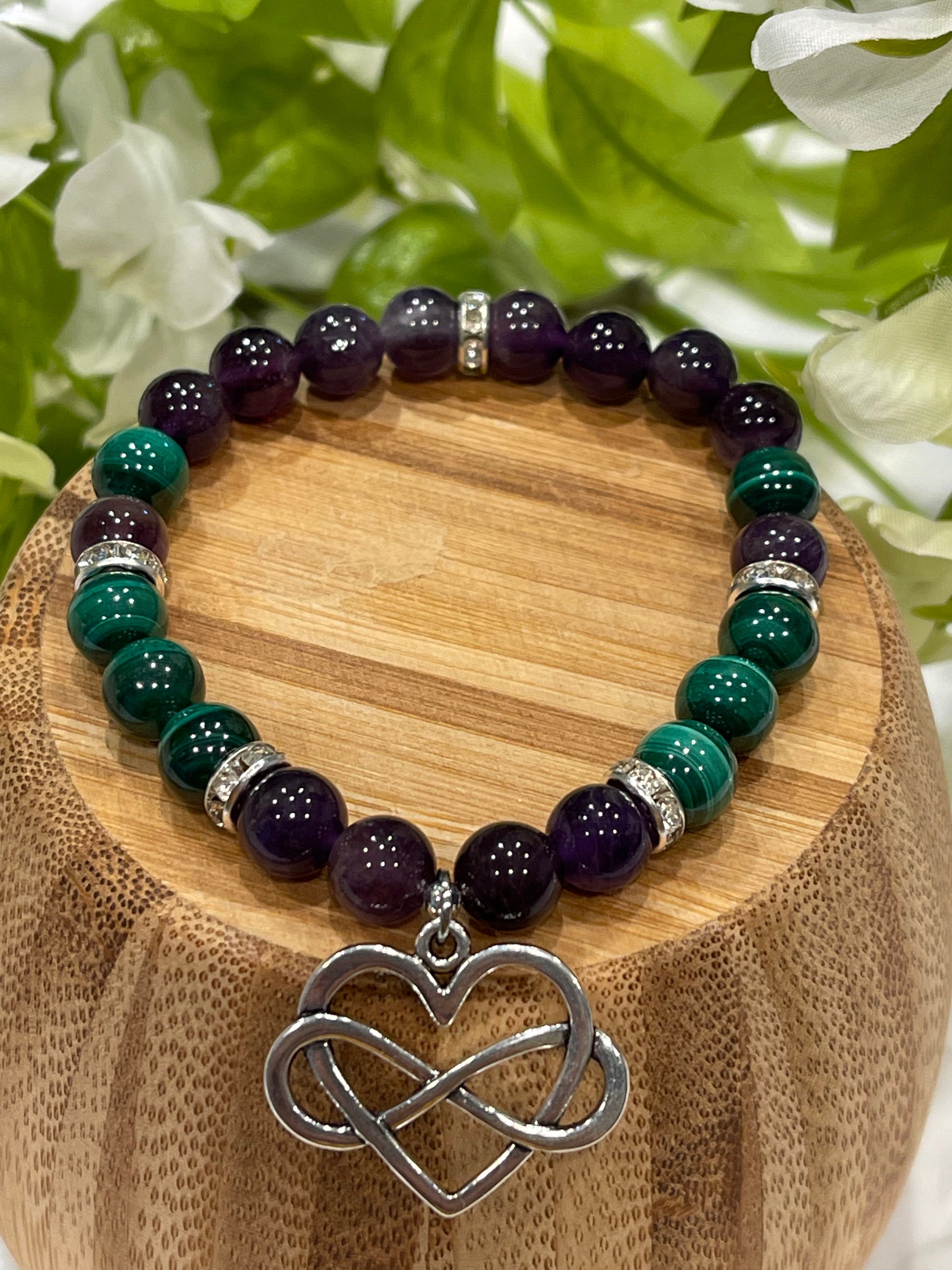 Amethyst combined with malachite is all about ONE-SELF, to trust, love and focus on one-self and to help remain calm.