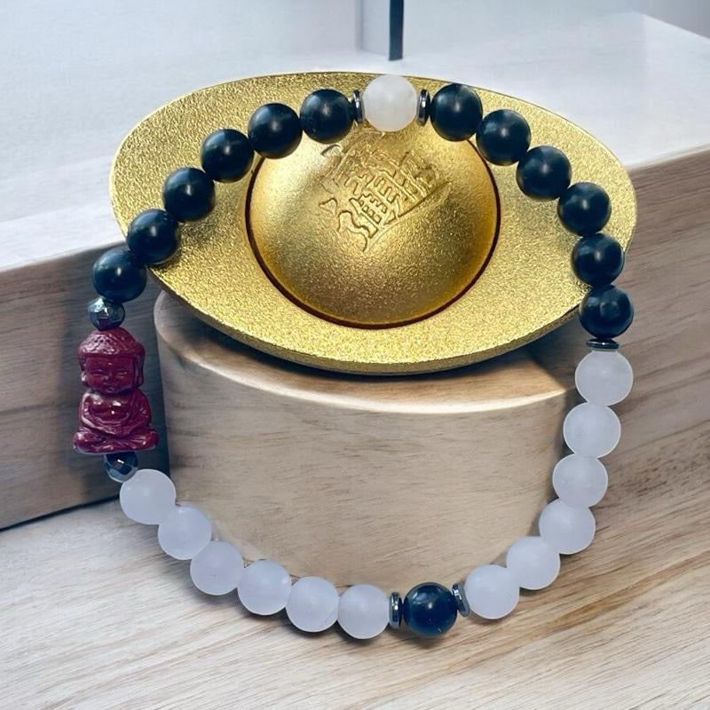 Black & White Jade Yin-Yang Bracelet with Cinnabar Buddha