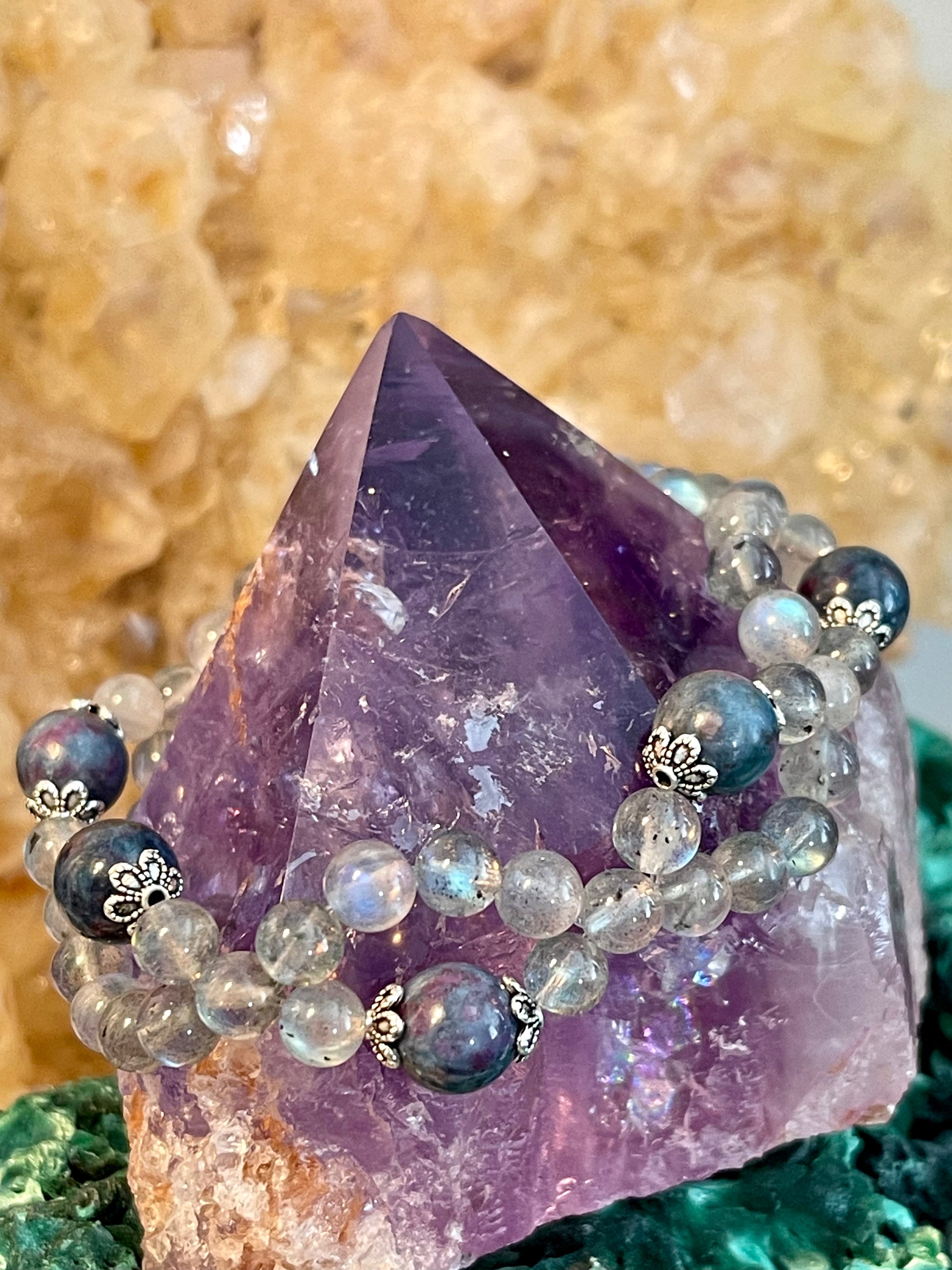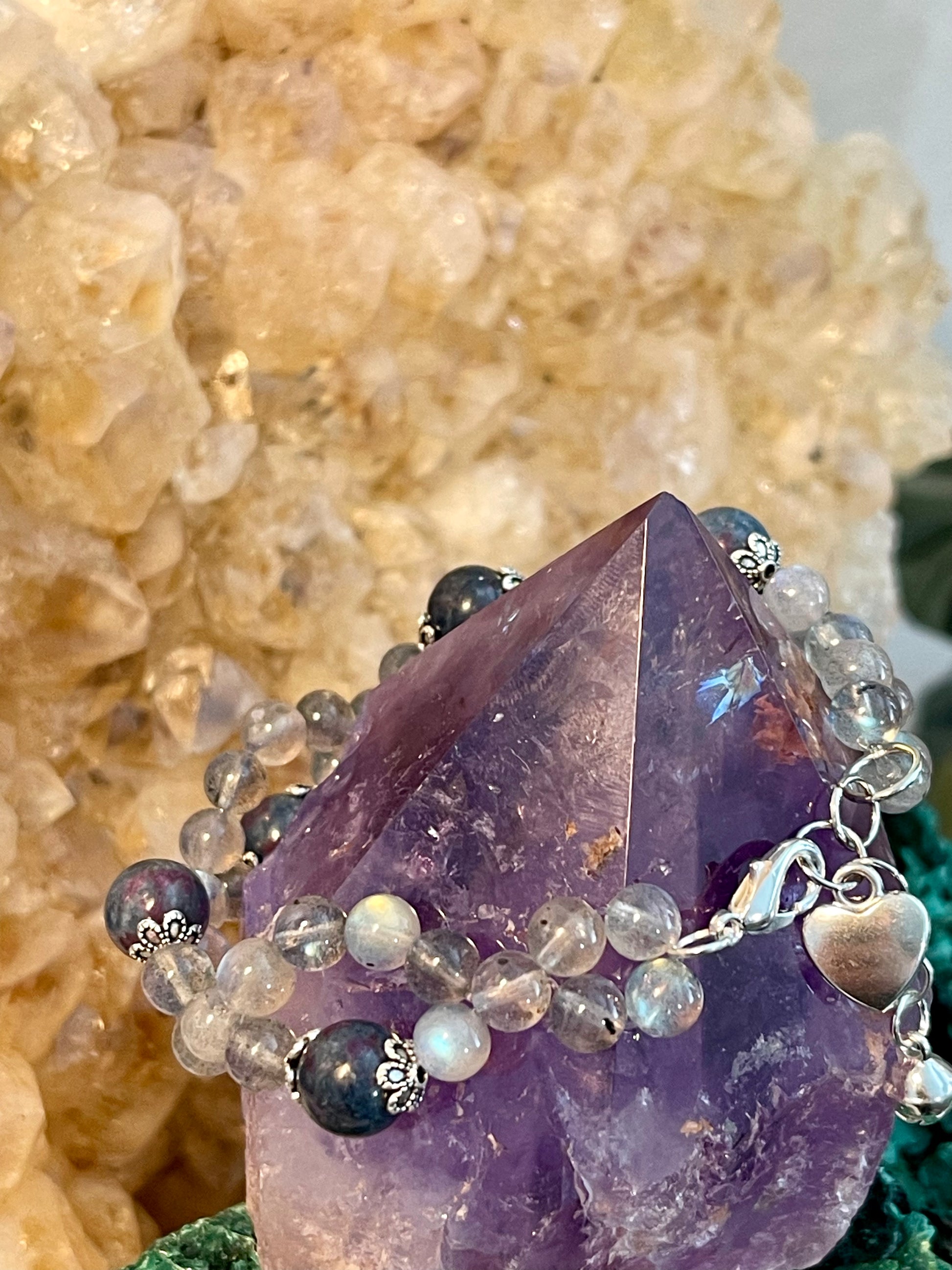 Double Twist Bracelet, Labradorite and Ruby in Kyanite; Enhance Intuition, Strength, Perseverance, Balance all Chakras, Promote Emotional Balance and Tranquility