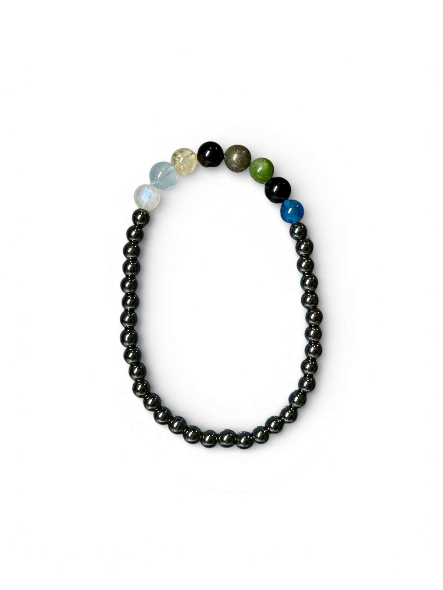 Hematite is used throughout the bracelet to anchor the energy, providing grounding, protection, and energetic stability — especially important in a fast-moving Fire year.