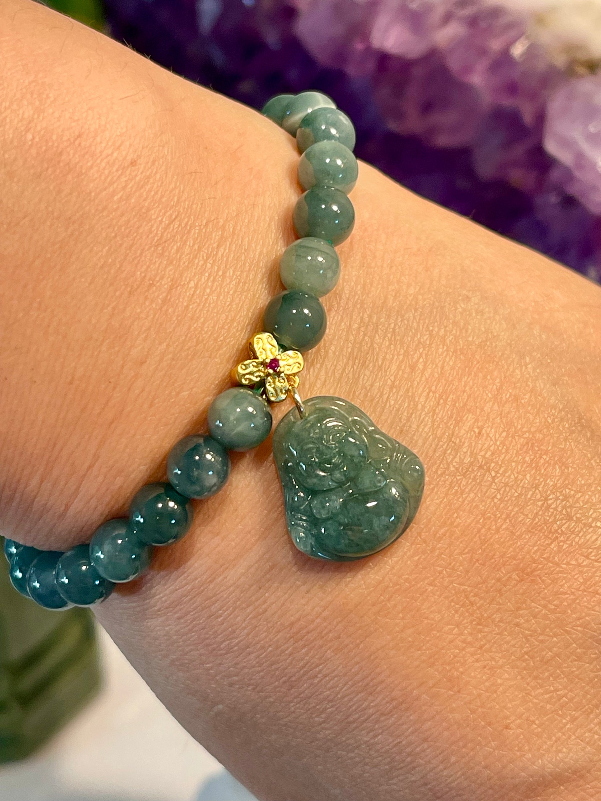 The Buddha depicted on a jade bracelet symbolizes enlightenment, compassion, and spiritual protection. Wearing such a bracelet is believed to bring good luck, prosperity, and blessings to the wearer. Additionally, it may inspire individuals to embody qualities such as mindfulness and inner peace.Â