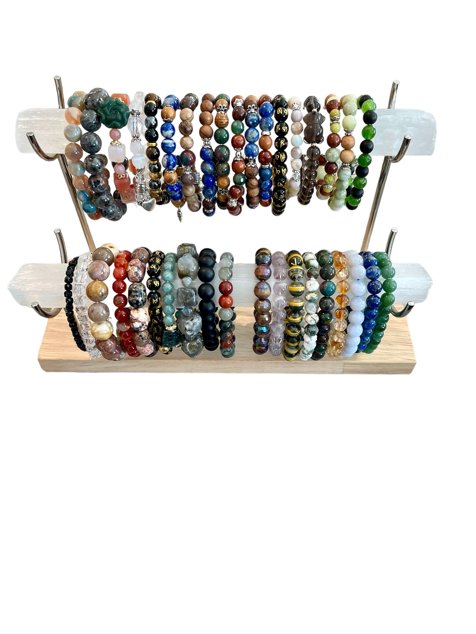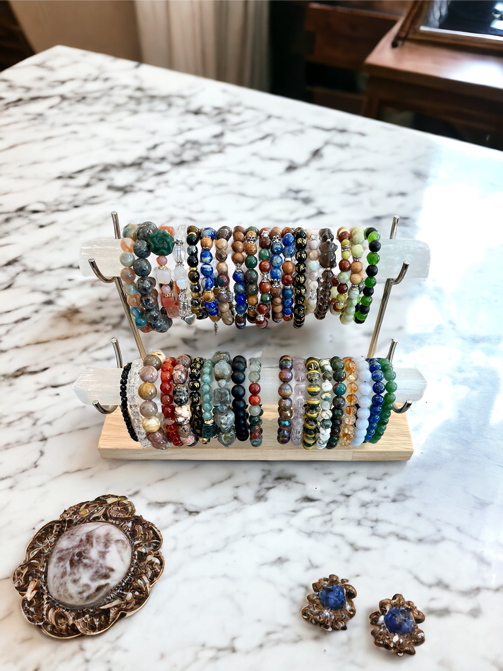 - Recharging Vibrations: Selenite has the ability to recharge and amplify the energy of other crystals and gemstones. By regularly placing your bracelets on the Selenite Bracelet Holder, you enhance the energy and vitality of the crystals in your jewelry, keeping them energetically charged and ready to benefit you.