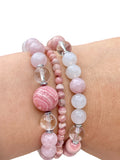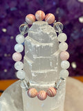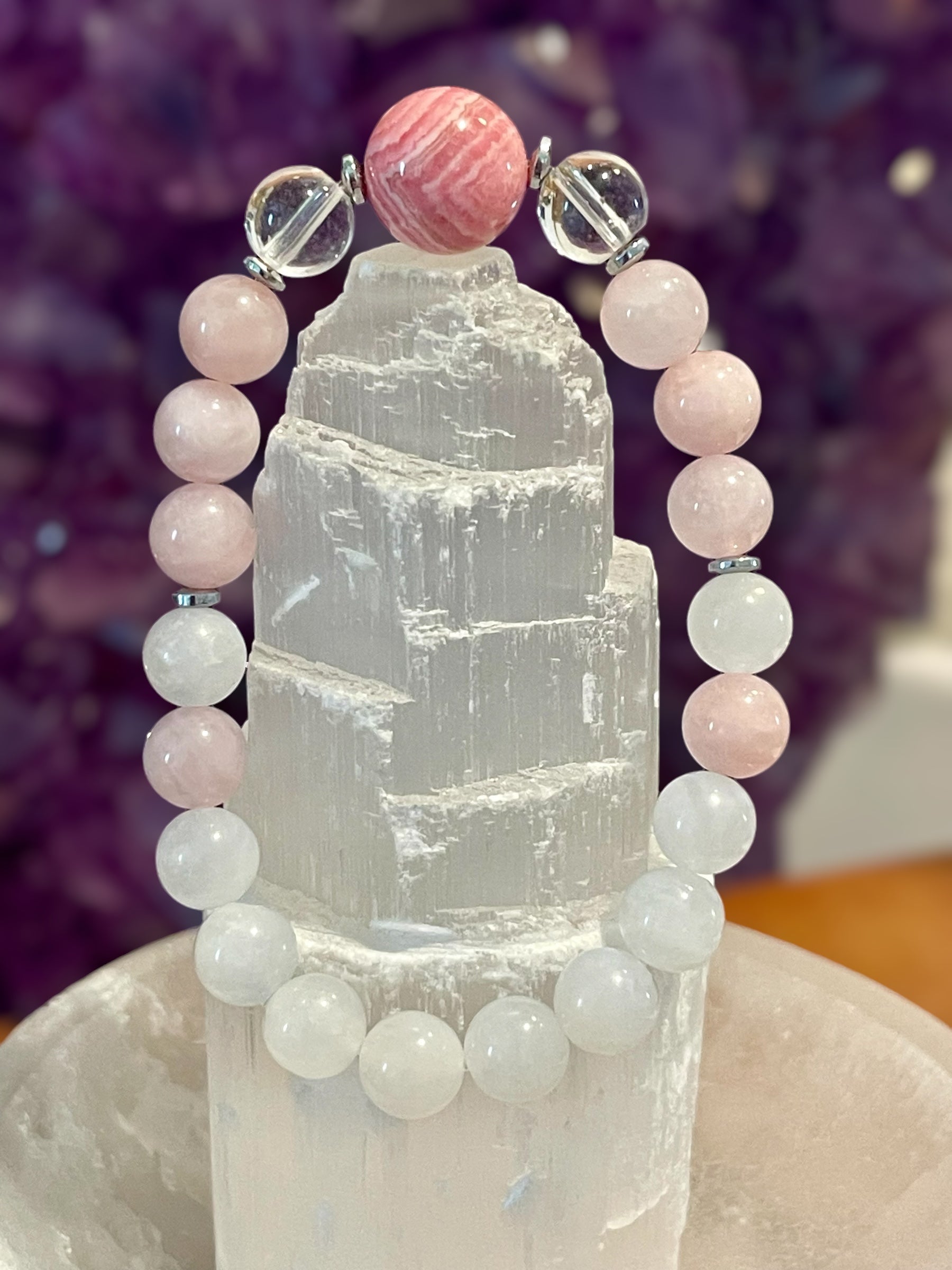 Introducing a captivating crystal bracelet that beautifully combines the healing energies of rhodochrosite, rose quartz, clear quartz and moonstone.